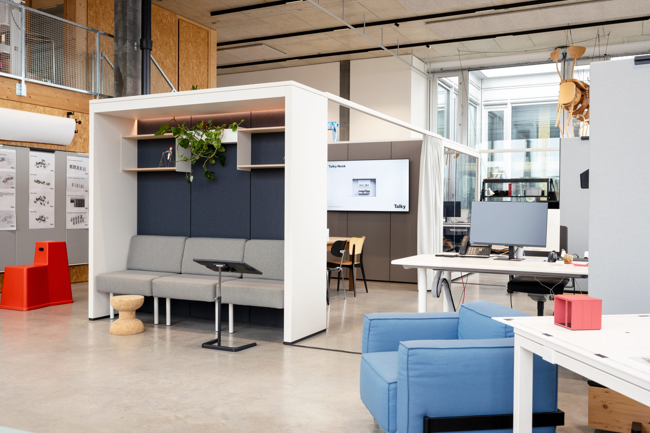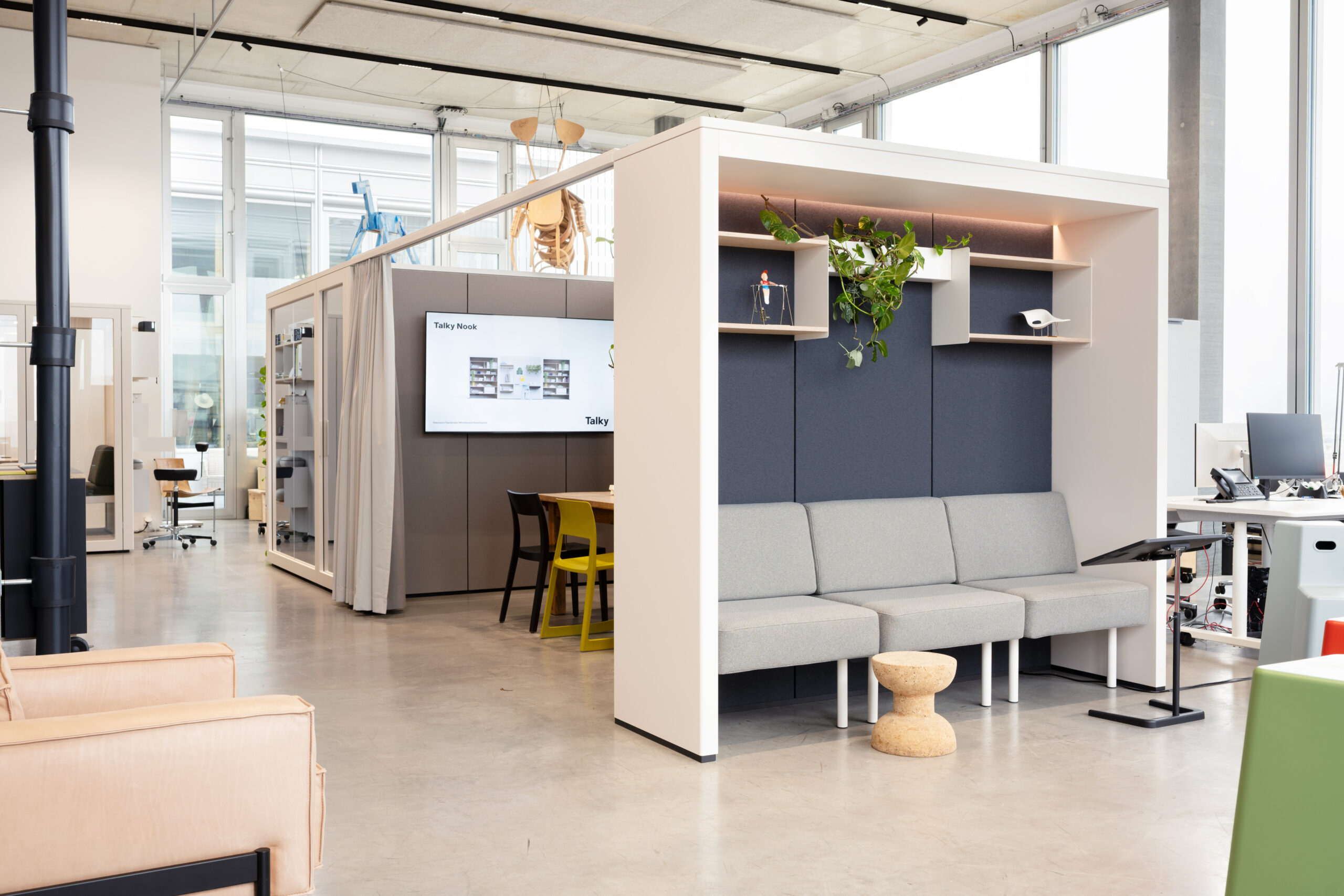Kaffeepause, spontanes Gespräch oder einfach kurz durchatmen. Talky Nook M75 schafft auf kleiner Fläche Raum für Ruhe und Fokus. Mit Ausstattungen wie Teeküche, Stauraum oder Whiteboard wird er zu einer funktionalen Nische mitten im Office.
